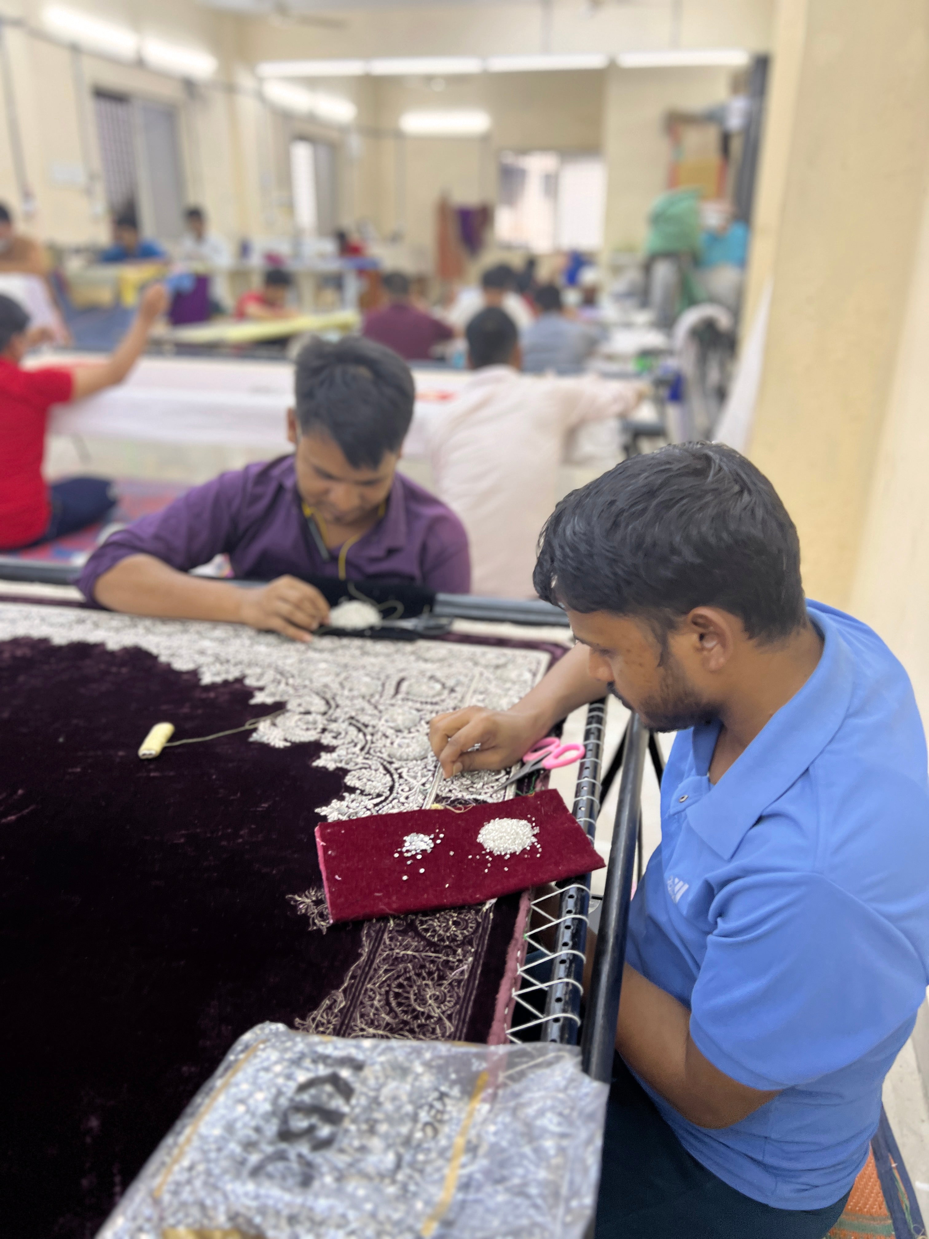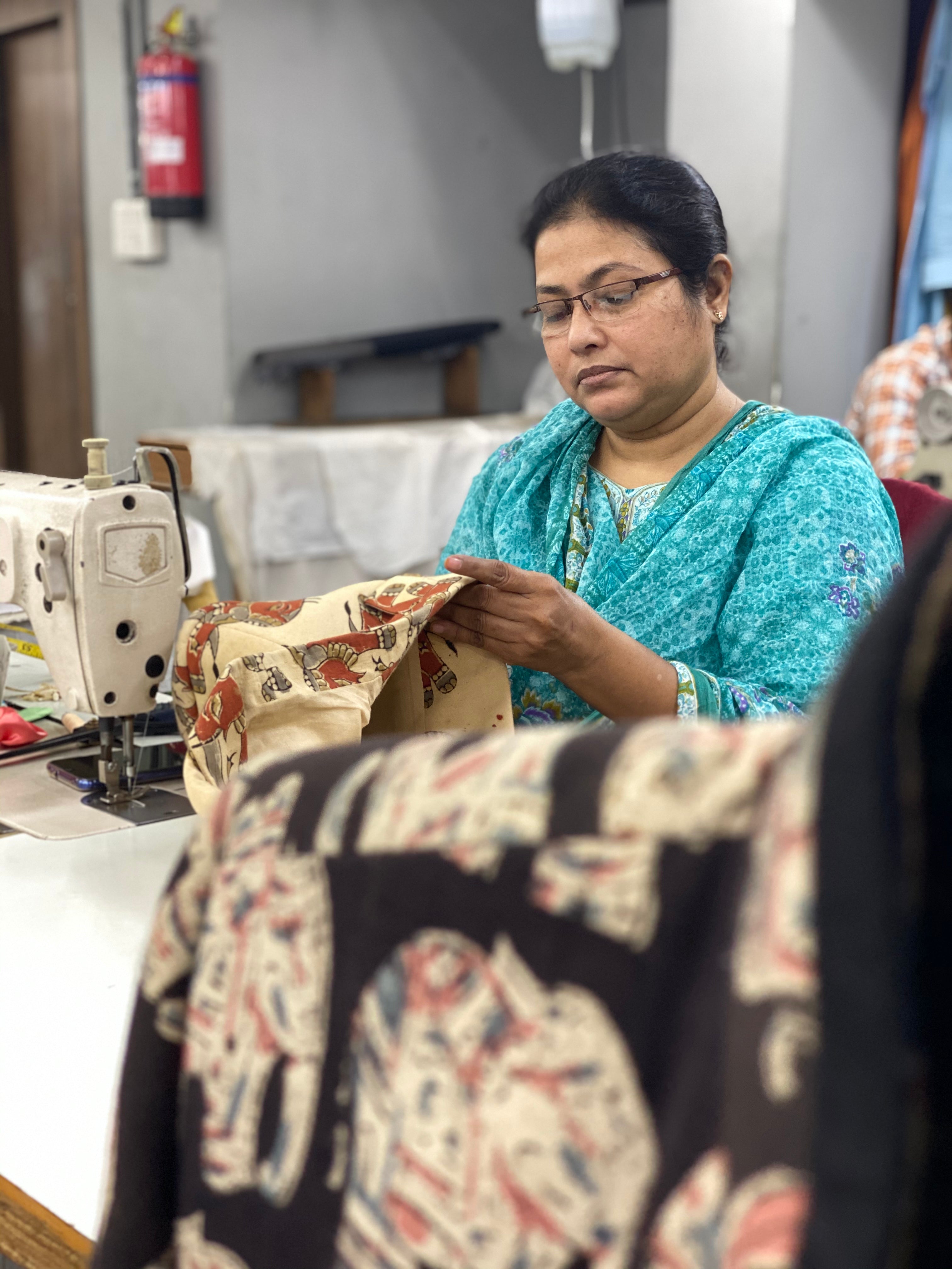 After the printing process and a final camphor wash, our fabric enters the skilled hands of our coat makers. With an unwavering commitment to details, it takes them three days to meticulously cut and sew each garment. Every piece is a labor of love, embodying the utmost care and exquisite craftsmanship.